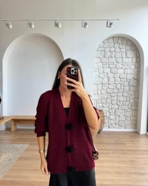 Knitted Rose Detailed Burgundy Cardigan