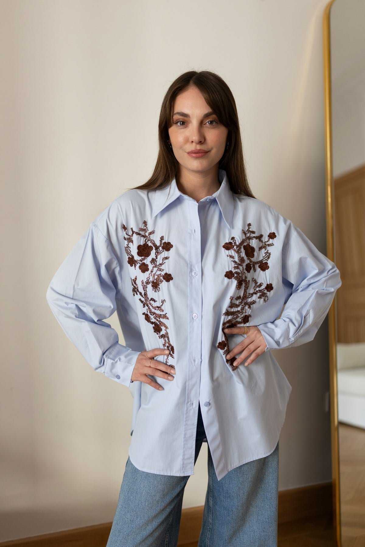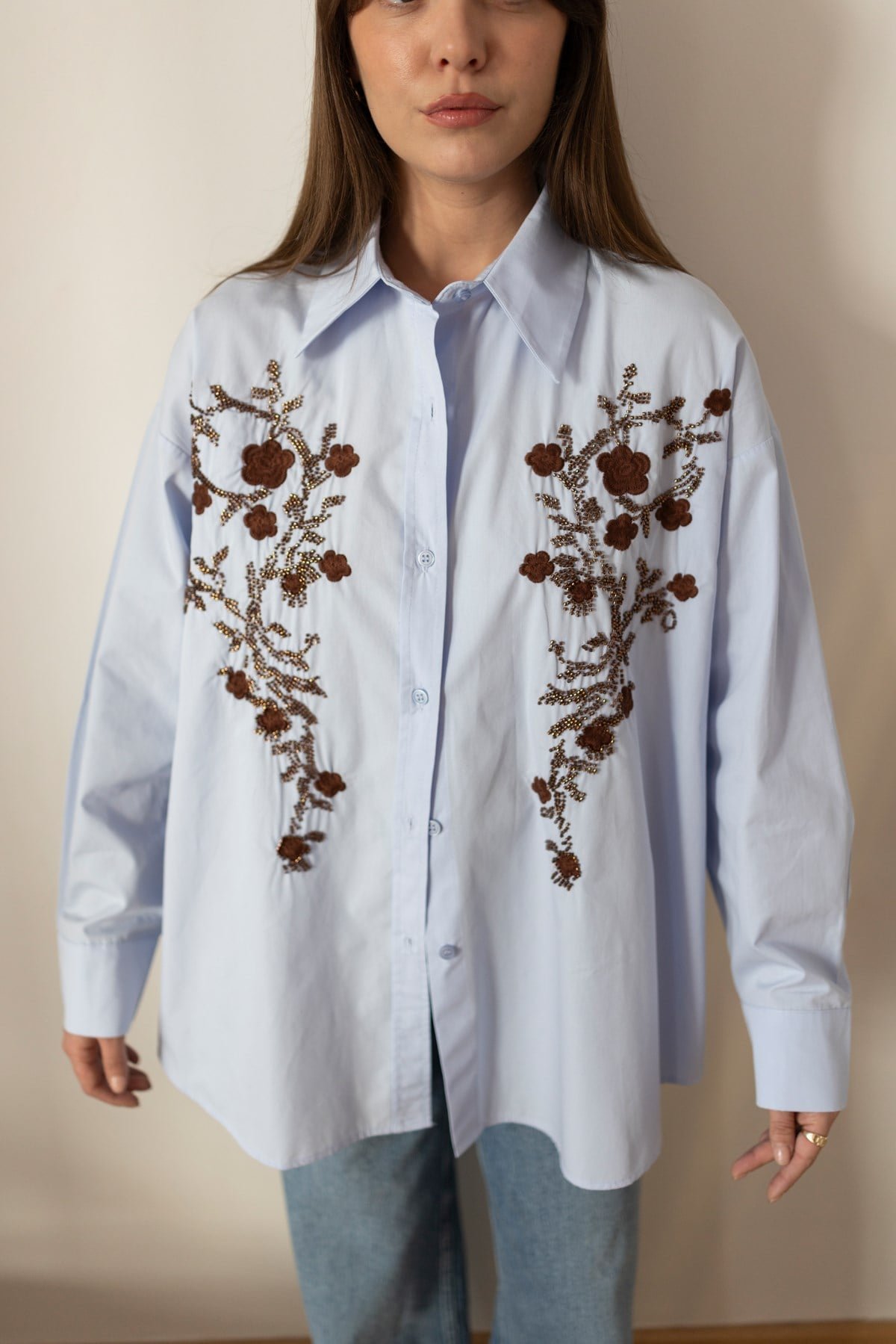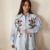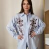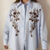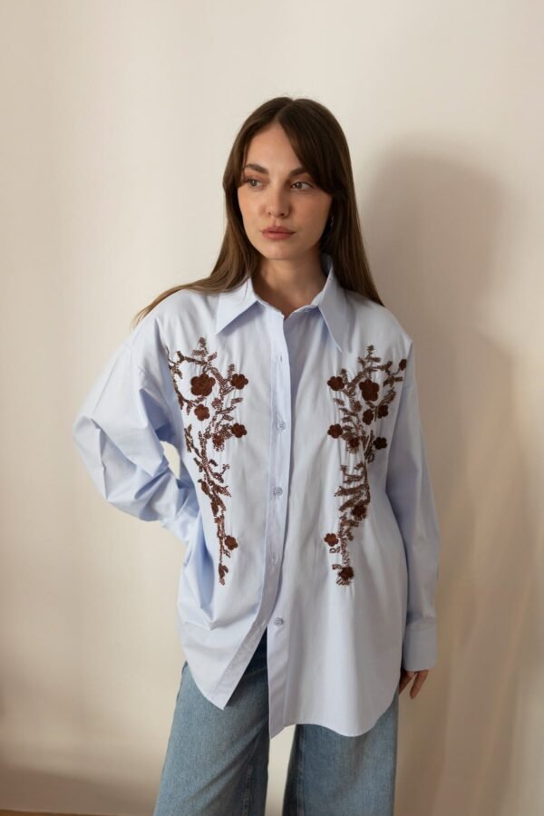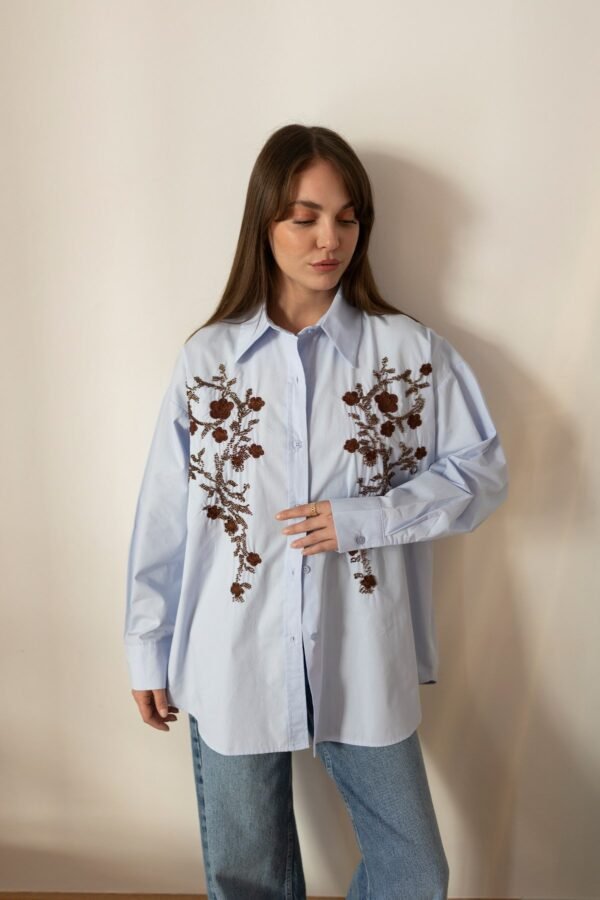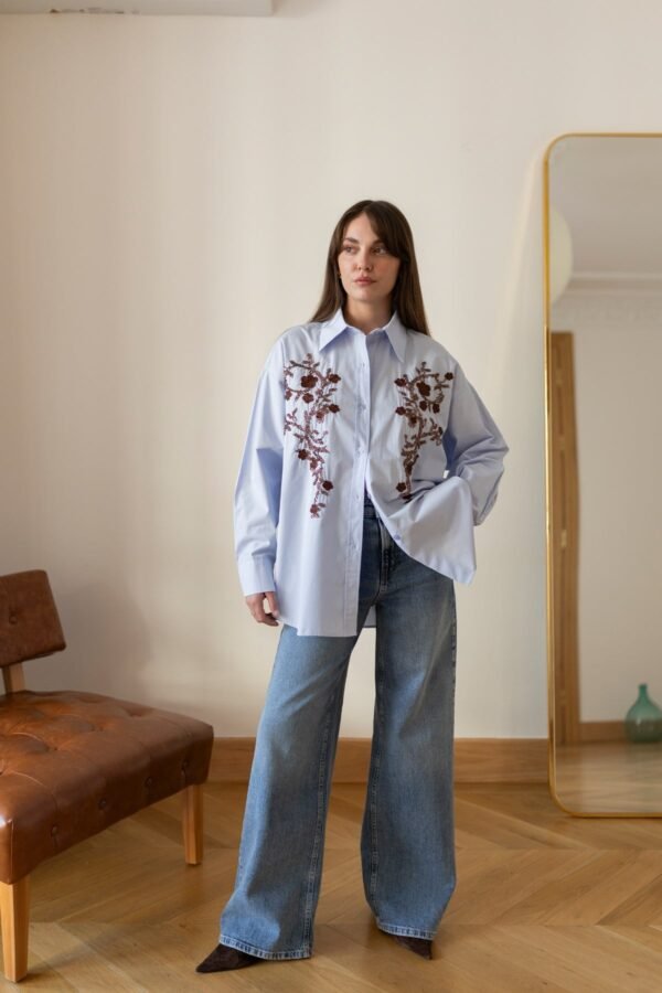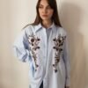 Blue Oversized Shirt with Beaded Floral Embroidery