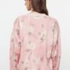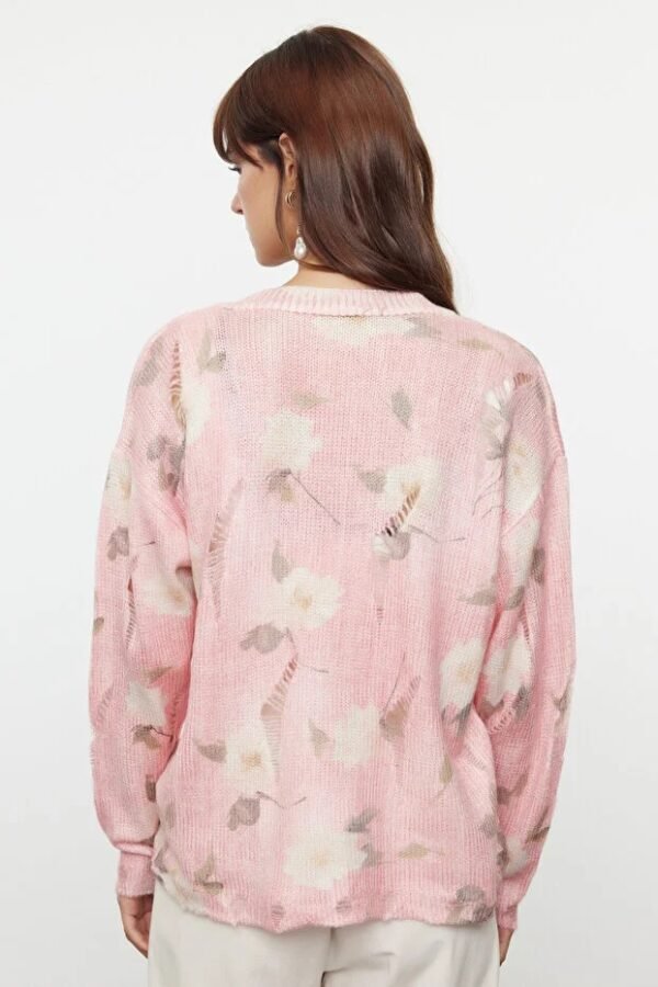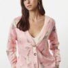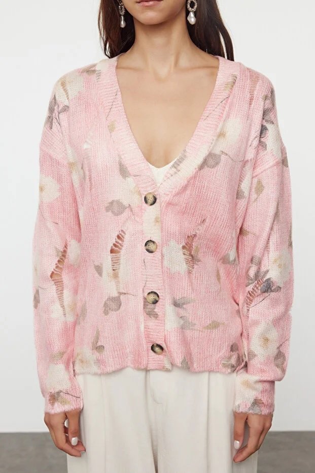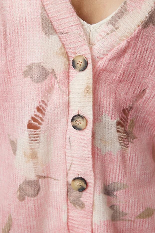 Pink Textured Knit Cardigan with Printed Details