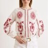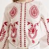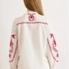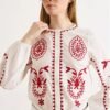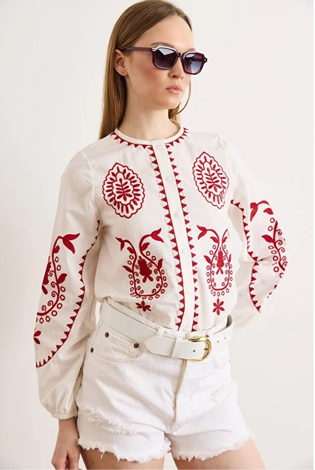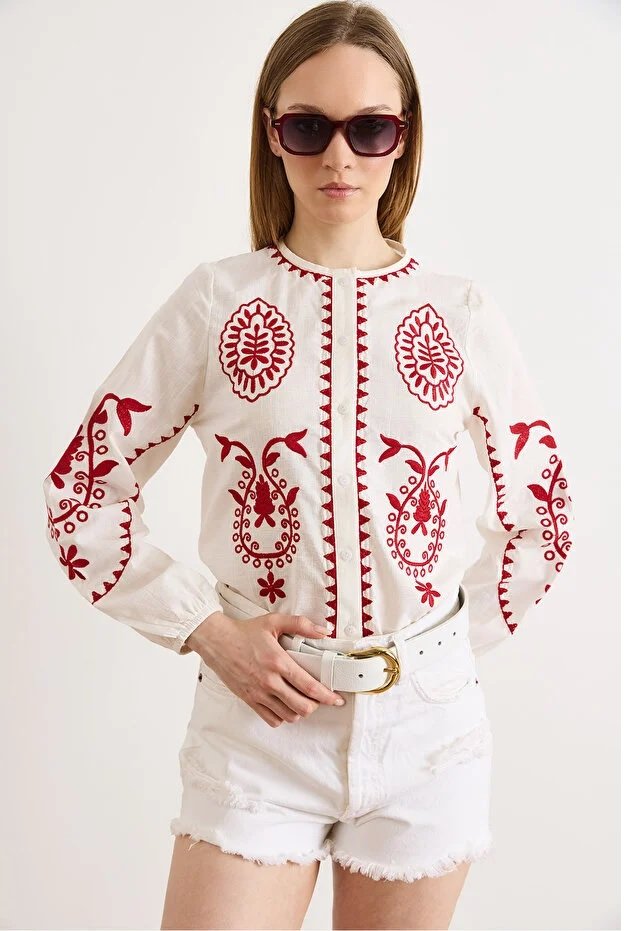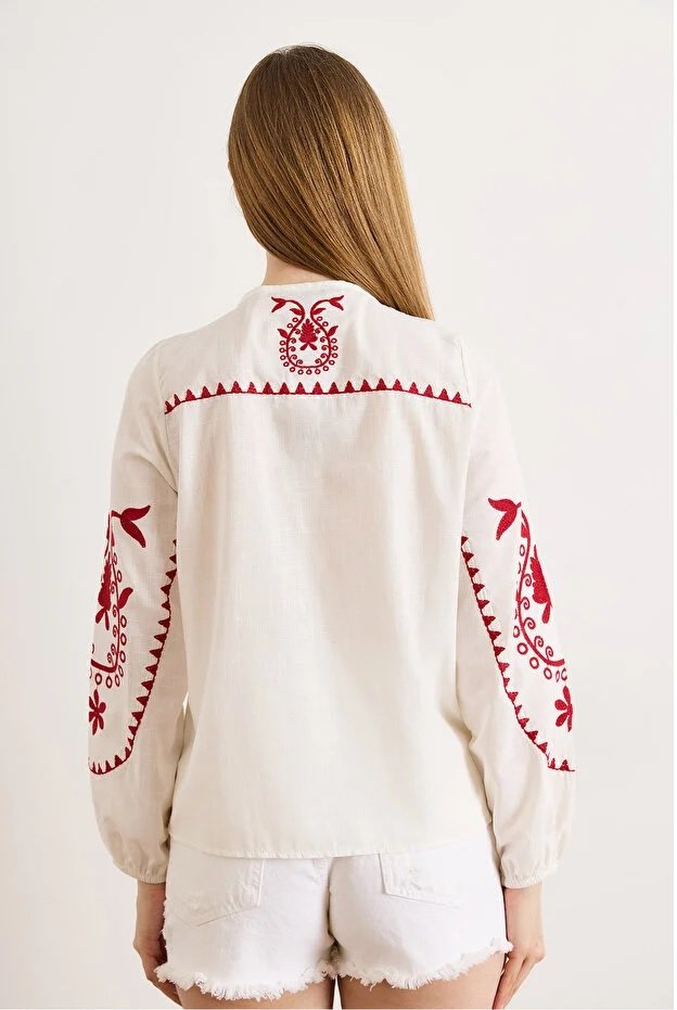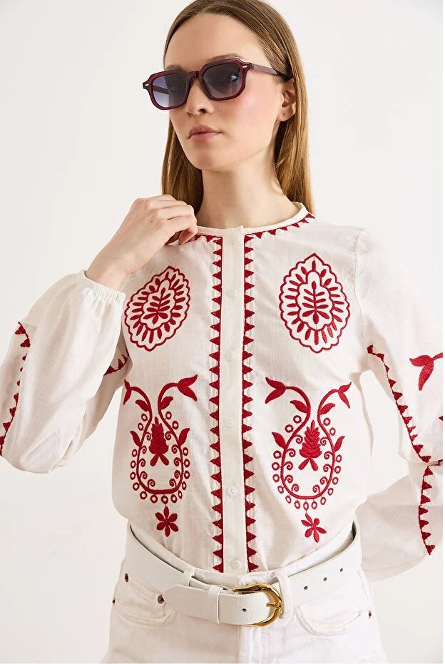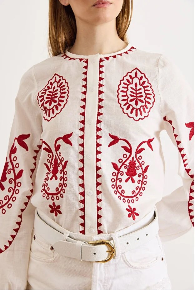 Women’s Cotton Boho Embroidered Crew Neck Shirt in White and Red