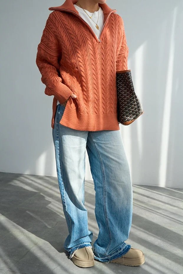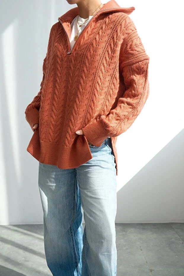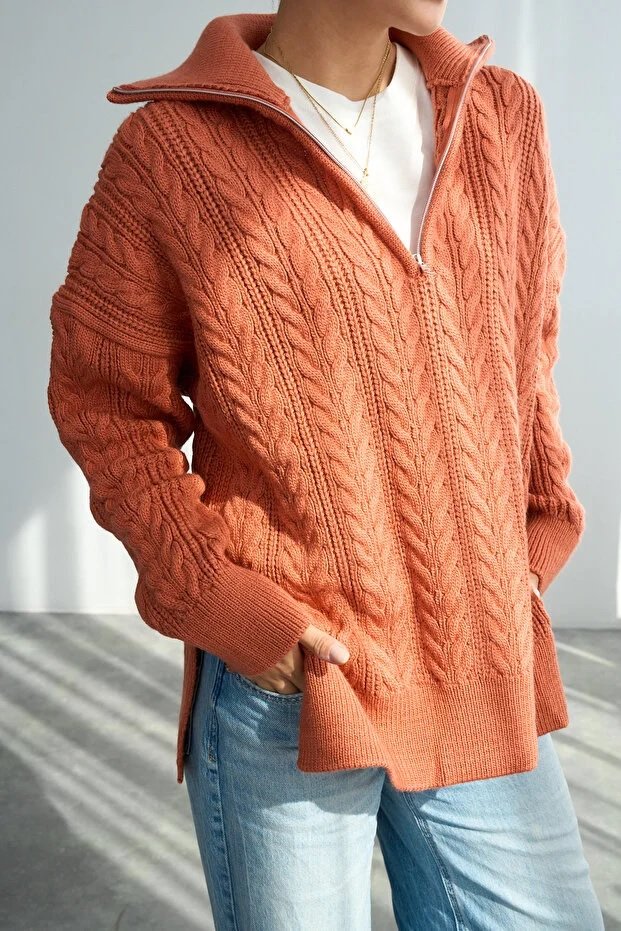 Chic Women’s Orange Oversized Cable-Knit Sweater Featuring a Zip-Up Collar and Premium Texture