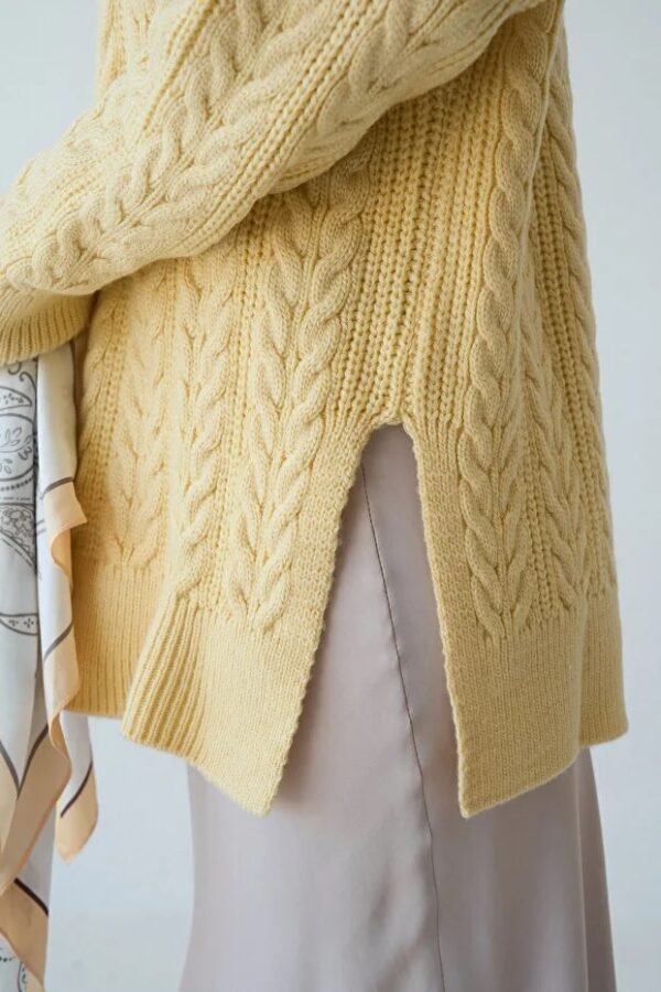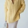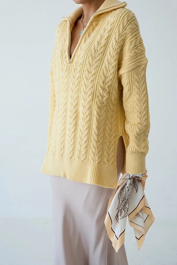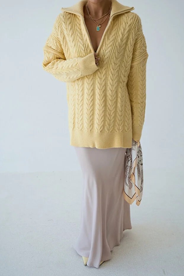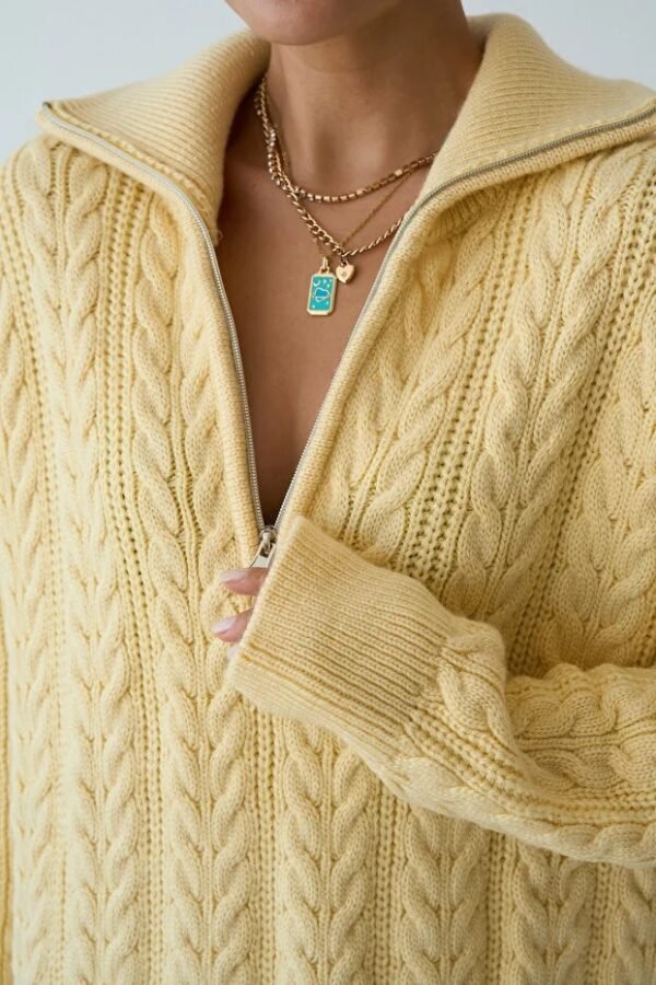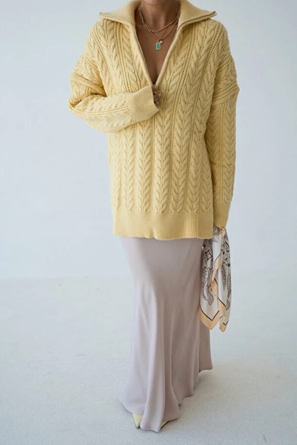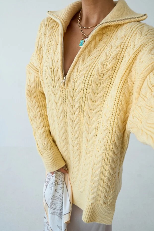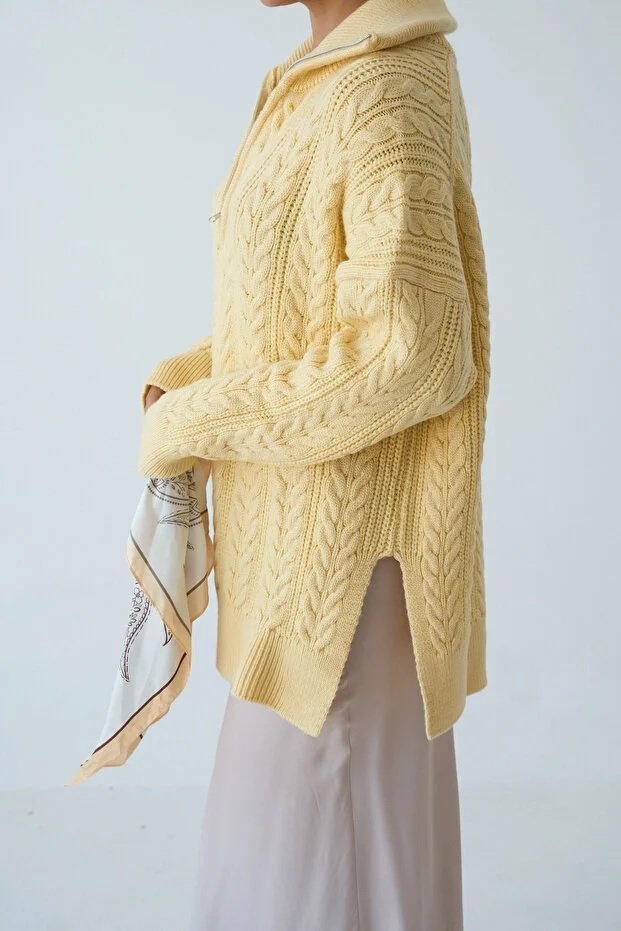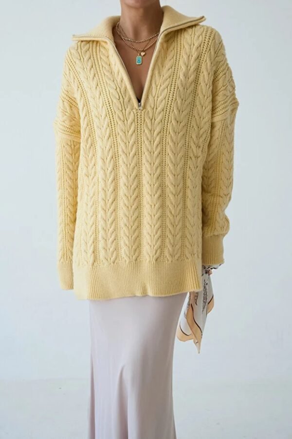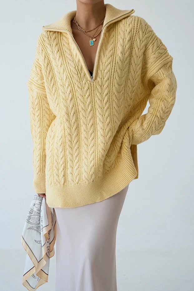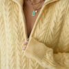 Women’s Zip-Up Collar Cable Knit Pattern Premium Texture Oversize Sweater