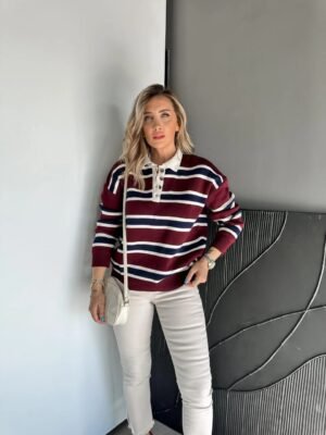 Burgundy Polo Collar Striped pullover